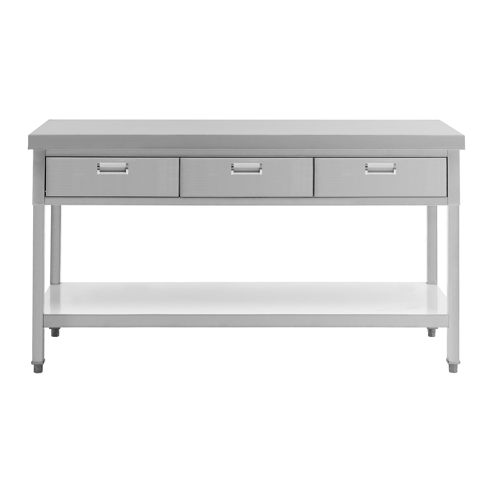 Stół roboczy ze stali nierdzewnej z szufladami zapewnia powierzchnię roboczą o wymiarach 150 x 60 cm do przygotowywania posiłków. Dzięki nośności 150 kg możesz nawet wykonywać solidne prace na stole ze stali nierdzewnej. Odporna powierzchnia ze stali nierdzewnej jest wzmocniona panelem MDF. Stół roboczy ze stali nierdzewnej z szufladami oferuje dużo miejsca do przechowywania, a wszystkie przybory są w zasięgu ręki. Bezpośrednio pod blatem możesz przechowywać składniki i mniejsze przybory kuchenne, takie jak tłuczki do mięsa, trzepaczki lub noże, w trzech płynnie wysuwanych szufladach o wymiarach 44 x 40 x 11 cm każda. Na większe przedmioty i pojemniki do przechowywania dużo miejsca znajdziesz na dolnej półce o powierzchni 146 x 56 cm. Oznacza to, że zawsze masz wszystko pod ręką na każdym etapie pracy! Dzięki meblom ze stali nierdzewnej nie tylko wzbogacasz wyposażenie kuchni, ale także spełniasz wszystkie normy higieniczne, które są niezbędne w dobrej kuchni. Materiał jest bezpieczny dla żywności, więc nie musisz się martwić o przygotowywanie potraw. Gładkie powierzchnie można łatwo wyczyścić i zawsze wyglądają ładnie i błyszcząco. W szufladach Twoje przybory kuchenne są bezpiecznie chronione przed wodą, mąką i kurzem. Stół ze stali nierdzewnej z szufladami przekona Cię na długi czas dzięki wysokiej jakości i precyzyjnemu wykonaniu, które okazuje się niezwykle stabilne i trwałe. Dzięki dołączonym materiałom montażowym oraz szczegółowej instrukcji obsługi stół roboczy ze stali nierdzewnej jest szybki i łatwy w montażu.